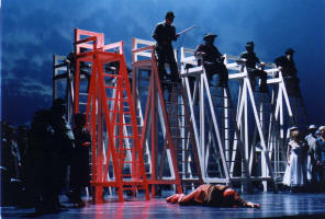Aber was wird aus dem Paar? Stolzing, hätte er durch den Trick mit Sachs den Preis nicht gewonnen, er wäre freiwillig ausgewandert samt seiner Eva. Bei Max reicht die Mobilitätsgarantie nicht so weit. Um so mehr stellt sich die Frage: Werden sie nach dem Prüfungs-Jahr, der sozusagen Bewährung in der Produktion, noch zusammen sein? Werden sie’s überhaupt noch wollen? Macht nicht diese Treue-Zusatz-Prüfung das ganze Verfahren noch absurder, oder geht’s Agathe gar wie Jenufa, dass sie gar nicht mehr "rein" und allein ist und was Drittes dann "entsorgt" werden muss? Und der "Jäger"-Job für Max – ist der wirklich so erstrebenswert? Was hieß es denn, im Biedermeier sich einzurichten, warten auf kommende Zeiten, warten, dass das, was in Deutschland nicht stattfand, aber was der Kapellmeister Weber bei seiner musikalischen "Tour de France" auf Umwegen gleichsam herüberholen und überholen wollte, doch irgendwie noch kommt? Musste nicht auch ein Schubert vergebens anrasen gegen diese Metternich-Wand aus Stumpf- und Biedersinn in seinen Singspielen und Sinfonien? Was bleibt vom Fortschritts-Potential des Freischütz? Stolzing darf schon singen, Max muss noch schießen für die Braut. Aber die Frau als Handelsobjekt ist immer noch up to date. Das Licht der Aufklärung funzelt in der Hölle der Wolfsschlucht matt. Dabei ist der Luzifer, der dort sein Hauptquartier hat, ja ein "Lichtträger". Wozu war der Geist der Aufklärung nicht alles gut: Zu den mörderischsten Bestialitäten, die Menschen ersannen gegen Menschen. Bis hin zu Versuchen am lebenden Körper mit Bakterien, Milzbrand, mit Menschen als marutas, als "Holzklötzen" in der Mandschurei (1931), oder als lebenden und auch todgeweihten Geiseln wie im Moskauer Musical-Theater Nord-Ost und gestiegert in Beslan (Nordossetien), Sept. 2004. Und mittlerweile gibt’s Menschenfleisch ja im Internet.