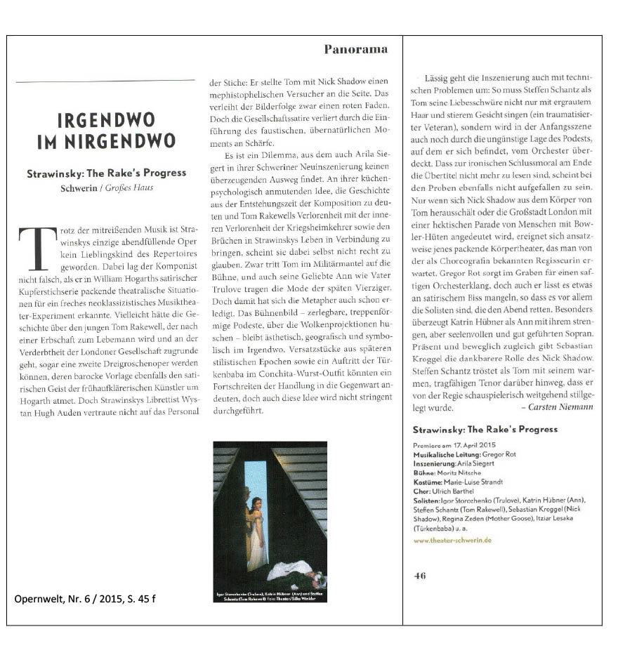 „Ausnahmekünstlerin“, nannte sie ein Washingtoner Kritiker. 1998 inszenierte sie zum ersten Mal Oper, Verdis „Macbeth“. Inzwischen ist Arila Siegert eine renommierte Regisseurin, die im vorigen Jahr mit Mozarts „Zauberflöte“ bei einem Opernfestival in Florida debütierte. Nach Händels „Alcina“ 2009, arbeitet sie erneut am Schweriner Theater. Sie inszeniert zum ersten Male Igor Strawinskys Oper „The Rake’s Progress (Das Leben eines Wüstlings)“, die auch zum ersten Male in Schwerin zu sehen ist. Und zu hören in Originalsprache.